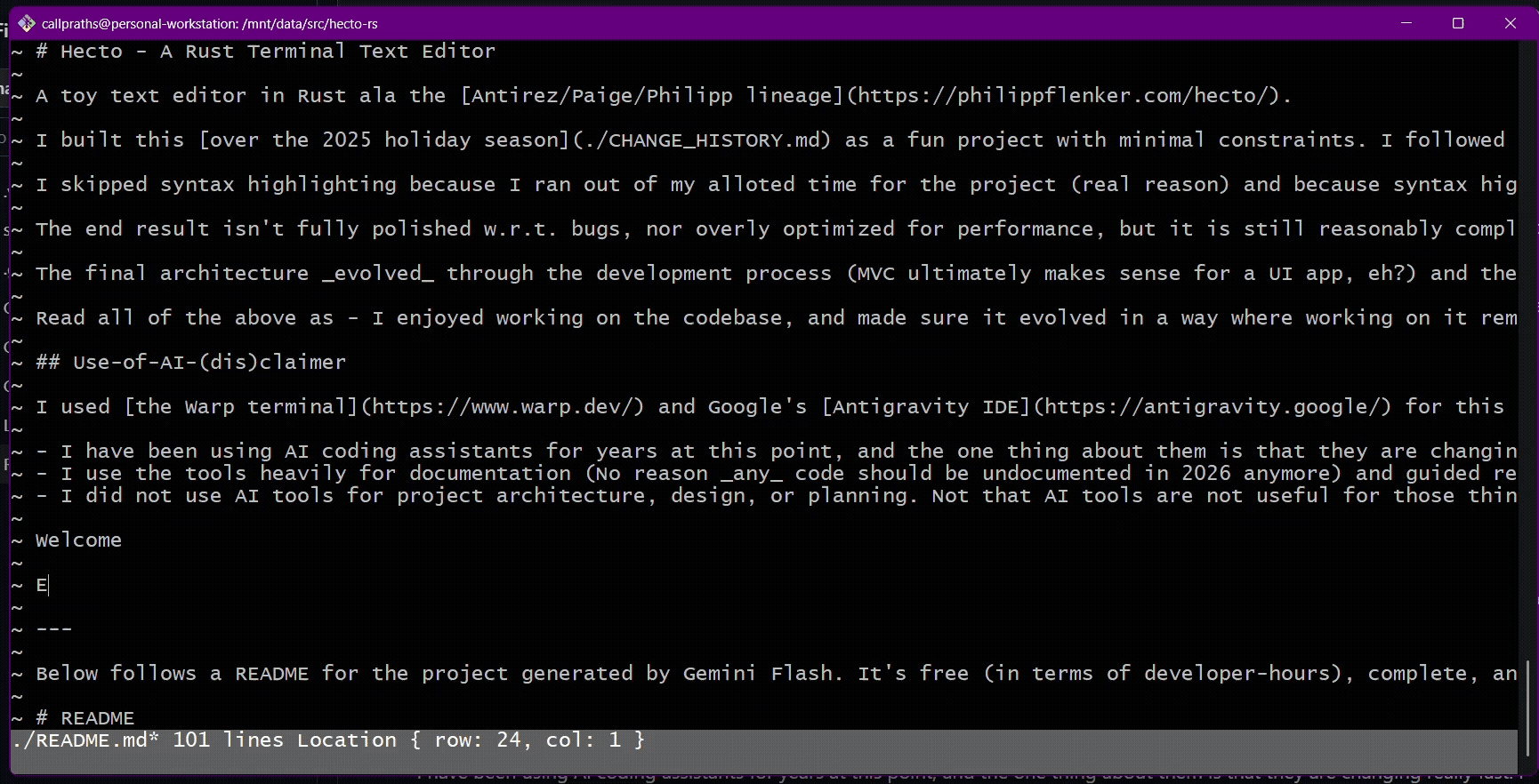A big shout out to Philipp Flenker for a great write up on a small project to build a terminal text editor in Rust called Hecto.rs.